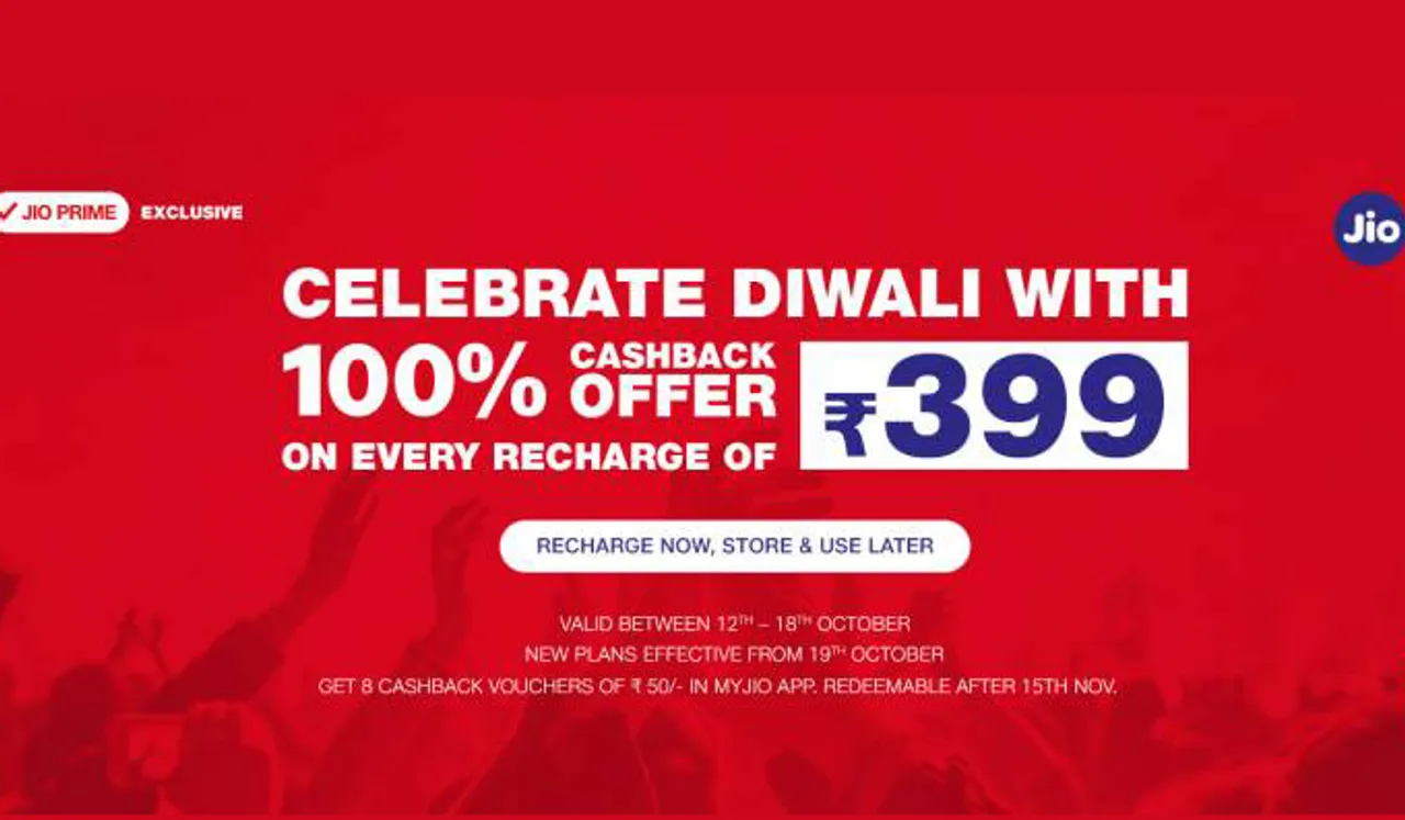 നവംബര് 10 മുതല് 25 വരെയുളള റീചാര്ജുകള്ക്കാണ് ഓഫര്. 399 രൂപയ്ക്കോ അതിനു മുകളിലോ റീചാര്ജ് ചെയ്യുന്നവര്ക്ക് 400 രൂപ ഇന്സ്റ്റന്റ് ക്യാഷ്ബാക്കായും 300 രൂപ ക്യാഷ് ബാക്ക് വൗച്ചറായും ശേഷിക്കുന്ന 1899 രൂപയ്ക്ക് ഇ കൊമേഴ്സ് വെബ്സൈറ്റുകള് വഴി ഷോപ്പിങ്ങും നടത്താം. ദീപാവലിക്ക് 399 രൂപയ്ക്ക് റീചാര്ജ് ചെയ്താല് 400 രൂപ തിരിച്ചു നല്കുന്ന ഓഫറുമായി വന്ന് ജിയോ ഞെട്ടിച്ചിരുന്നു.